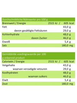 Enthält geringfügige Mengen an Fett, gesättigten Fettsäuren, Eiweiß und Salz