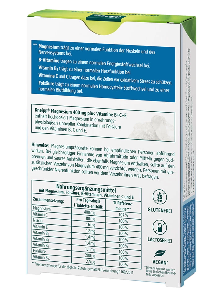 – enthält hochdosiert Magnesium und Folsäure in ernährungsphsysiologisch sinnvoller Kombination mit Vitamin B, C und E