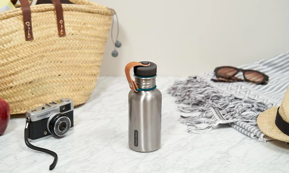 Die leichte Edelstahl-Trinkflasche von black+blum begeistert in modernem Retro-Design. Sie ist der perfekte Begleiter fürs Büro, die Uni, für Wandertouren, den nächsten Ausflug zum Badesee und viele andere Freizeit-Aktivitäten. Die Flasche aus Edelstahl hat eine praktische Trageschlaufe aus Veganleder und einen dicht abschließenden Schraubdeckel aus Polypropylen mit Silikonring. Der abgerundete Rand am Flaschenhals erleichtert das Trinken. Aufgrund des extra breiten Flaschenhalses können Sie auch Eiswürfel oder einen Aktiv-Kohlefilter hinzufügen. Perfekt für Erwachsene und Kinder. Fassungsvermögen: 500 ml