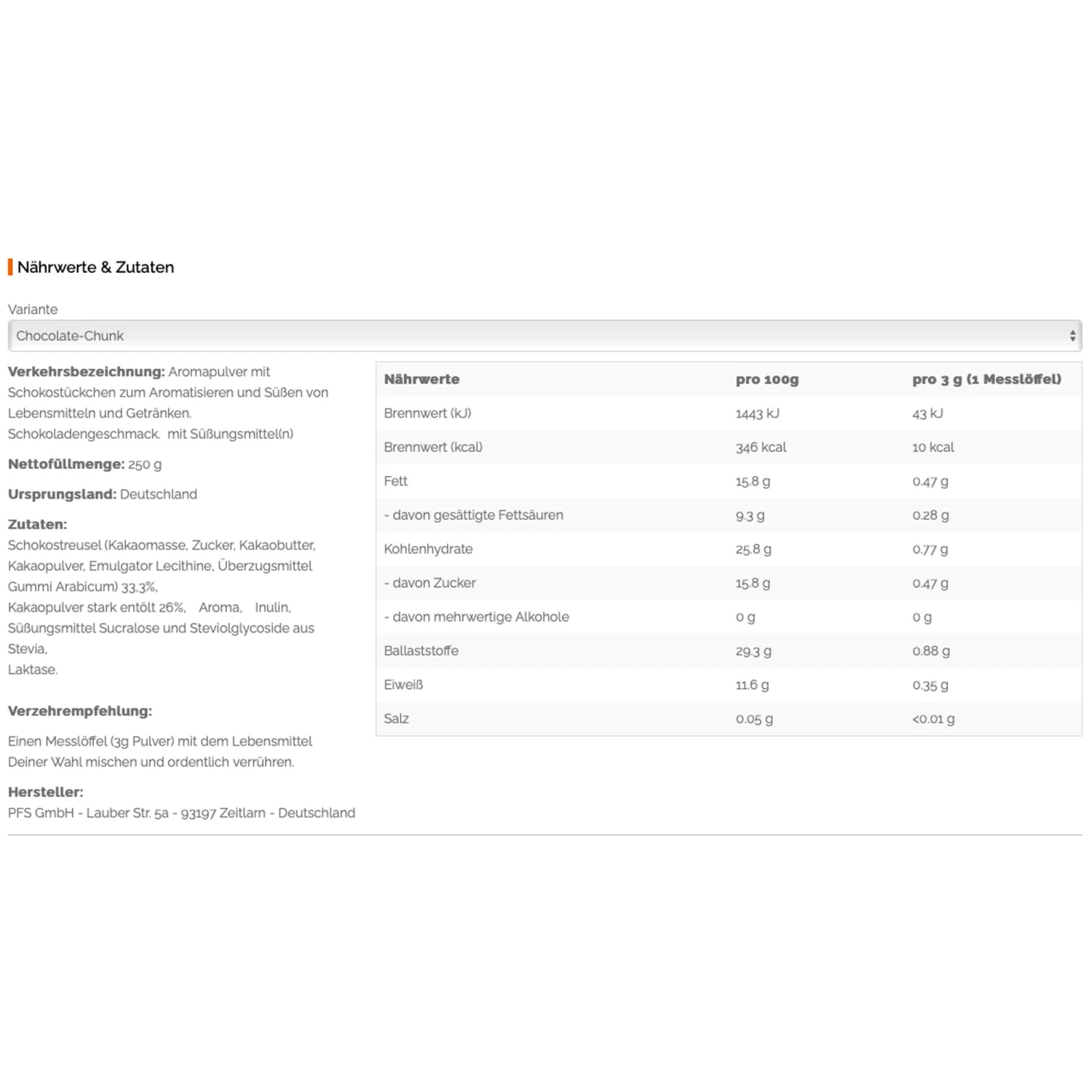 – Einige Geschmäcker mit Chunks (Stückchen) im Pulver. z.B. echte Pfirsichstückchen oder Schokostückchen