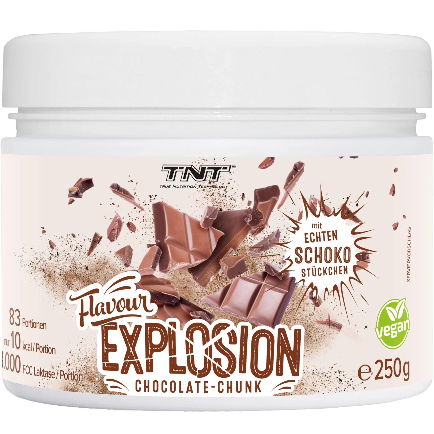 Unsere TNT Flavour Explosions sind zu 100% vegan und mit extra Stückchen versetzt (Sorten mit „Chunk“ (= Stückchen) im Namen). Mit 3000 FCC Laktase pro Portion wird sicher gestellt, dass Milchprodukte mit Laktose besser verdaut werden und so ein Blähbauch oder andere Symptome einer Laktoseintoleranz entgegengewirkt wird.