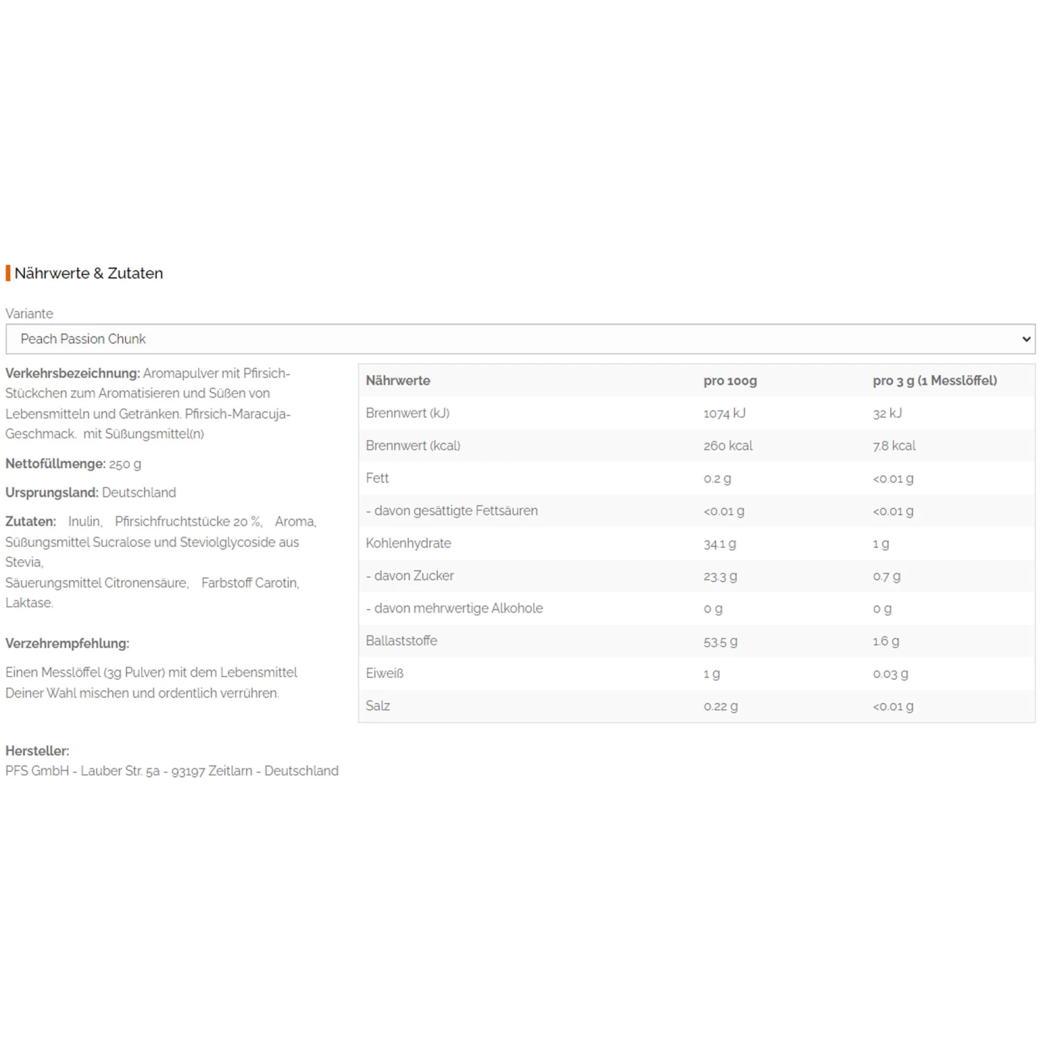 – Einige Geschmäcker mit Chunks (Stückchen) im Pulver. z.B. echte Pfirsichstückchen oder Schokostückchen