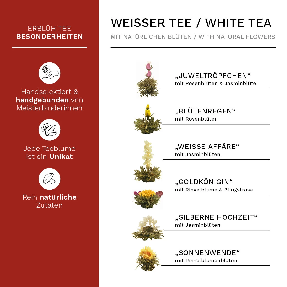 Der ErblühTee besteht ausschließlich aus dem Weißen Tee „Yin Zhen“, der auch „Silver Needle“ genannt wird. Der Name (zu deutsch: Silbernadel) leitet sich aus dem silbrig seidenartig schimmernden Härchen seiner Blattspitzen ab. Wegen seines samtig weichen und sehr milden Geschmacks sowie seiner unverwechselbaren leichten Aromen zählt dieser Weiße Tee zu den edelsten Teesorten der Welt.