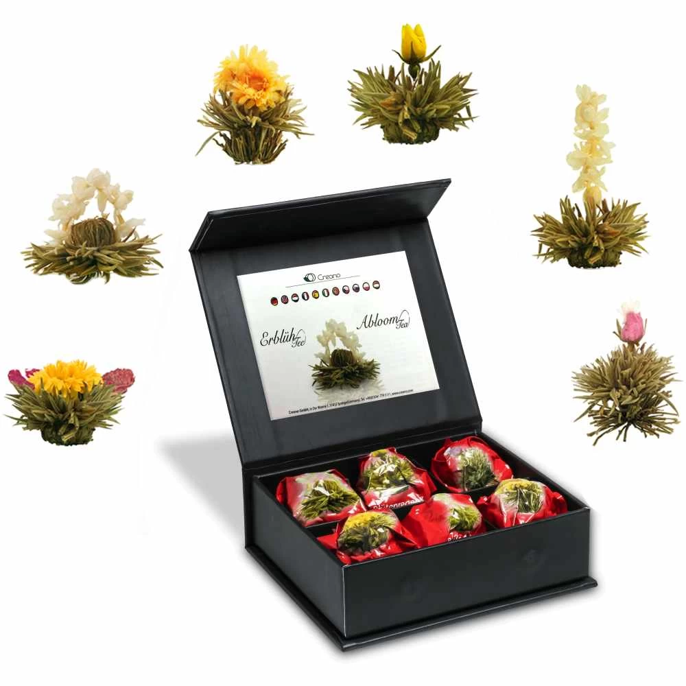 Die 6 ErblühTee-Kugeln in 6 verschiedenen Variationen sind in einer edelen mattschwarzen mit einem silbernen Prägedruck versehenen Magnetbox verpackt, welche das Teeerlebnis vom ersten Augenblick an zu etwas ganz Besonderem macht. Die hochwertige Verarbeitung und Stabilität gewährleistet auch eine Nutzung nach dem Verbrauch des Tees und kann je nach Belieben mit Nachfüllpackungen der ErblühTee-Kugeln nachgefüllt werden. Eine dekorative Nutzung bietet sich ebenso an…