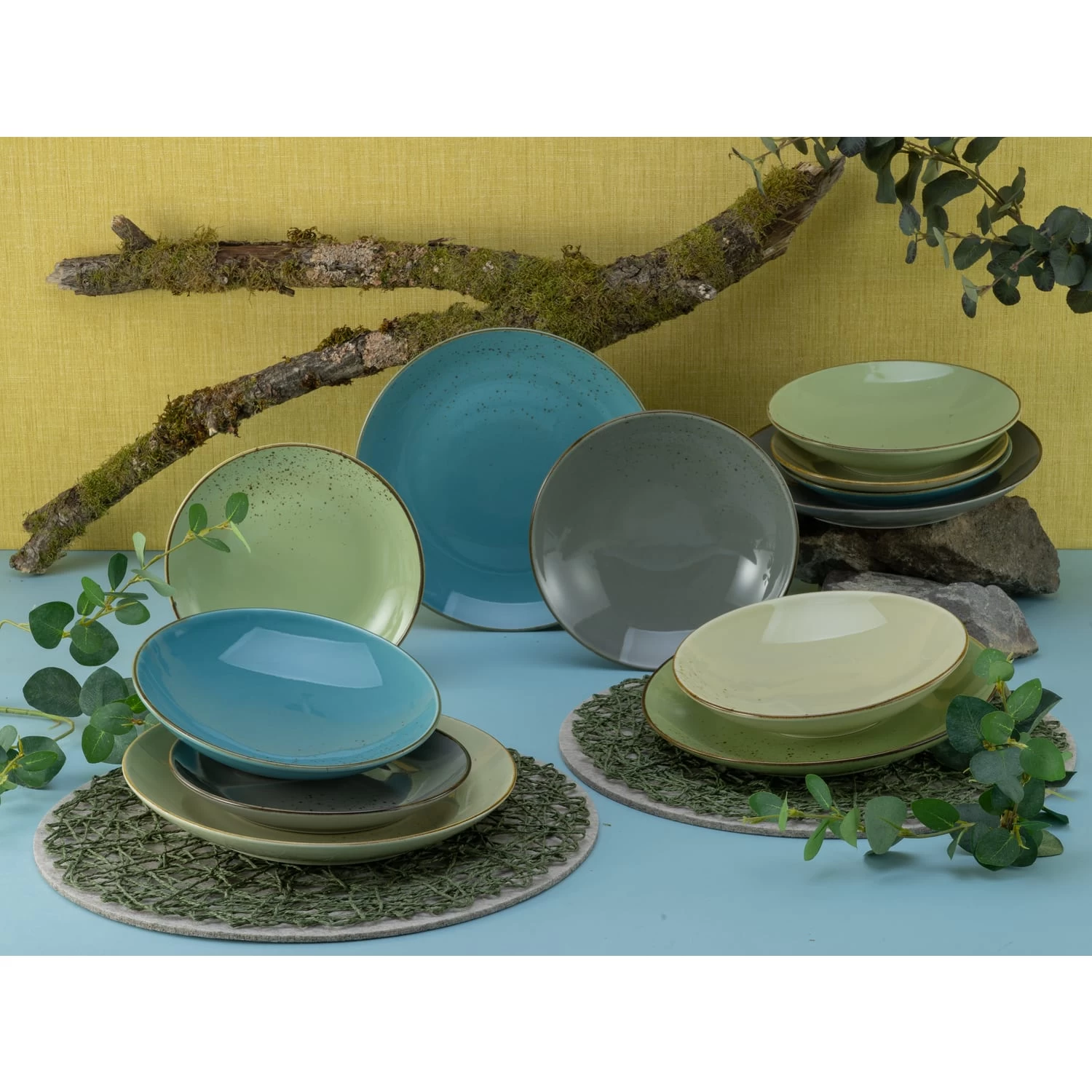 Das hochwertige Steinzeug präsentiert sich in einer hochaktuellen Coupeform mit sortierten Naturglasuren.